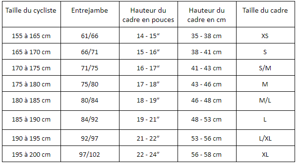 Si le modèle de VTT que vous convoitez est exprimé en taille XS, S, M etc., pas de panique ! On vous donne les équivalences dans le tableau ci-dessous (il vous suffit de comparer le chiffre en cm ou en pouces obtenu plus haut) :